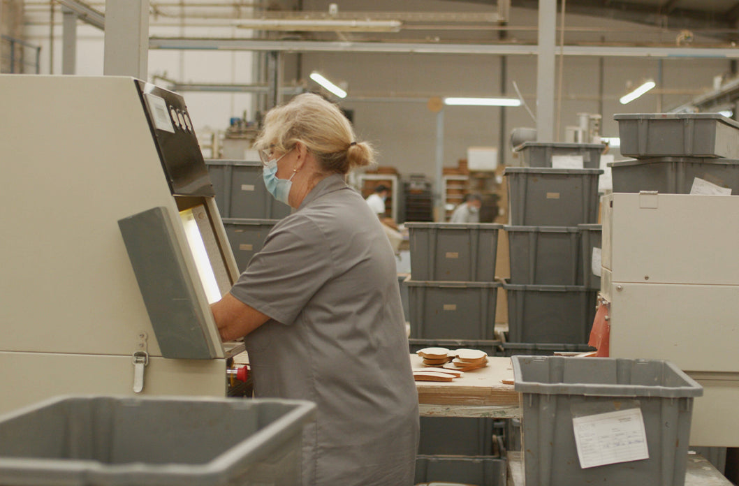 Our production process starts from receiving the recycled cork trimmings that have been shaped into pliable sheets. The dark layer of cork is naturally smoked so that it retains a beautiful brown colour and is then glued to the light layer with non-toxic glue. Each sheet is cut into our custom mould, then finished and checked by hand by our makers for imperfections.